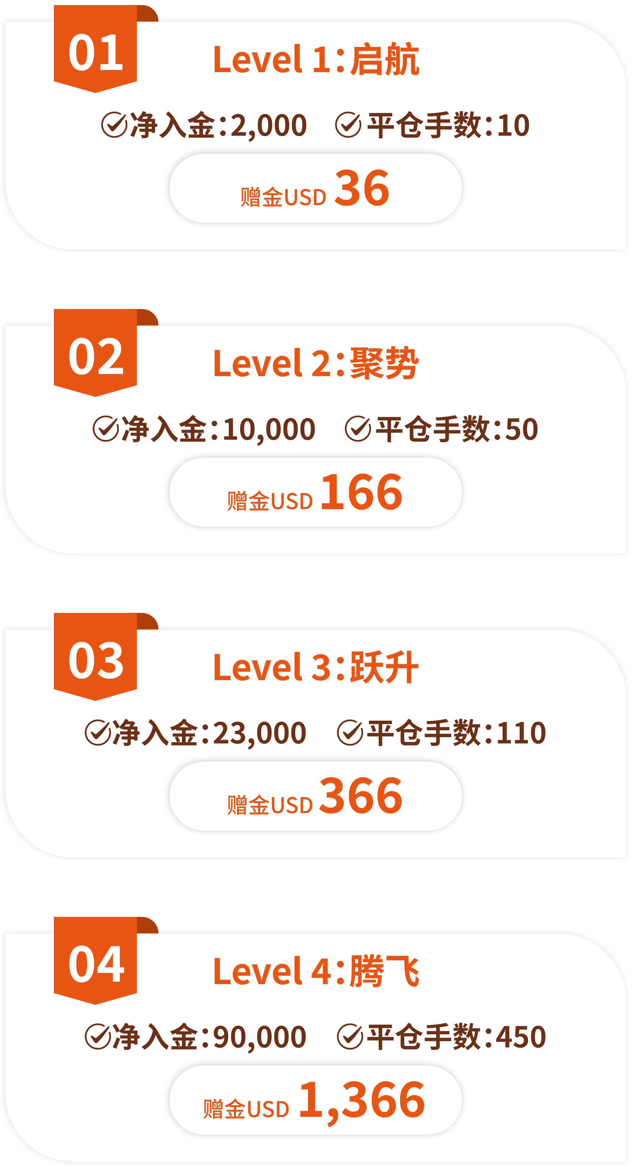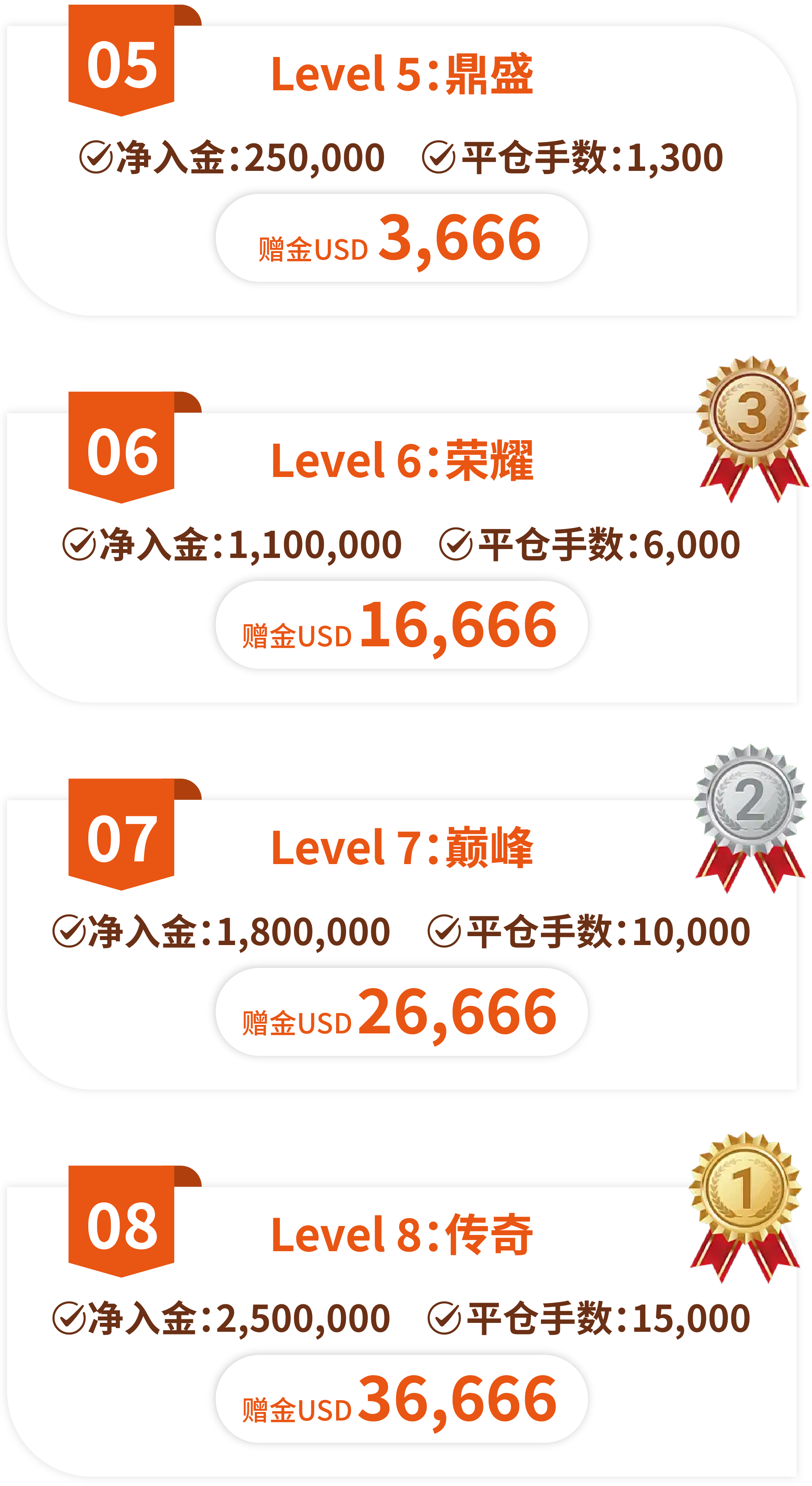 从启航到传奇,八大层级逐级解锁!活动期间内,达成指定净入金与平仓手数,即可解锁对应层级赠金奖励,最高可享 $36,666赠金回馈。