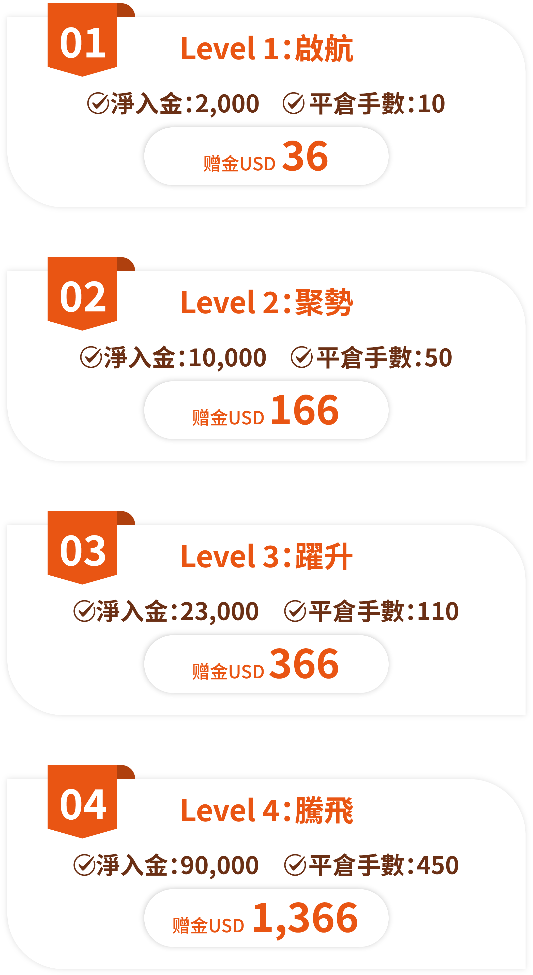 從啓航到傳奇,八大層級逐級解鎖!活動期間內,達成指定淨入金與平倉手數,即可解鎖對應層級贈金獎勵,最高可享 $36,666贈金回饋。
