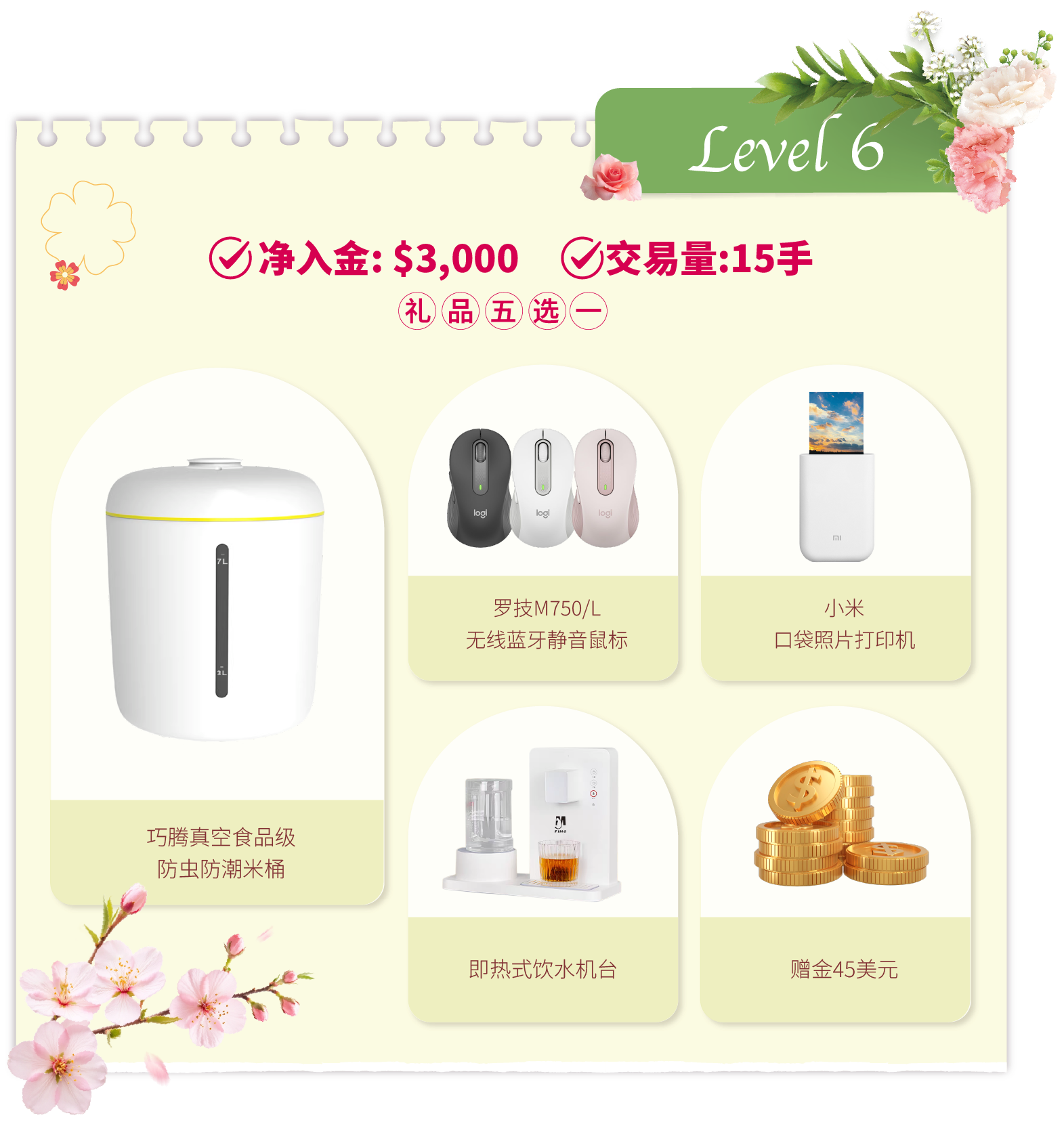 在活动期间内,客户的净入金和平仓手数(美股产品不计算在内)达到相应要求,即可在该层级的五件精选礼品中任选其一。若通过亨达APP完成交易,平仓手数将享有三倍累计计算,助您更快达成目标!
