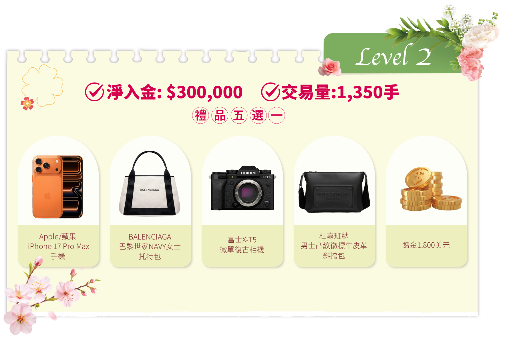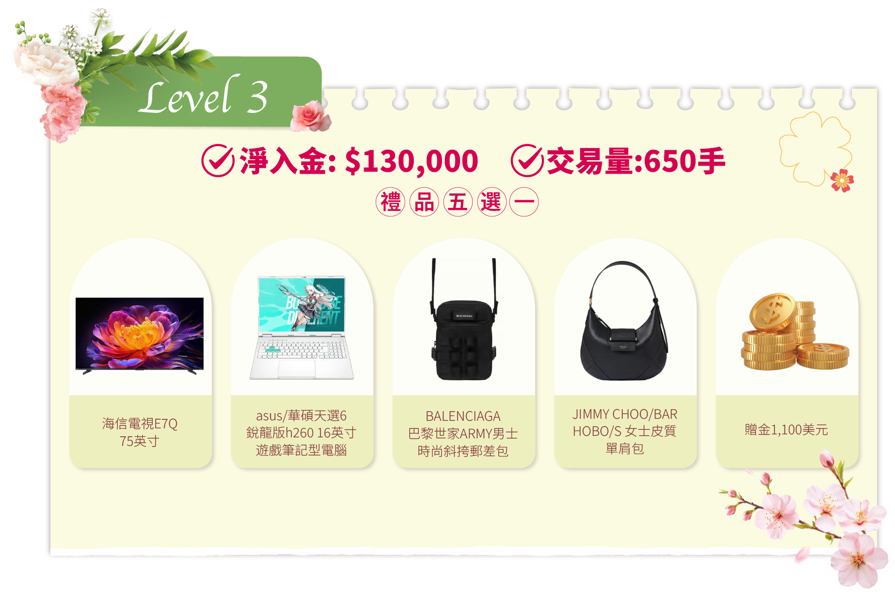 - 活動結束後的獎品發放流程:統計結果後,我們將安排專人聯繫各達標客戶。聯繫時會提供一個表單鏈接給獲獎者填寫。該表單用於收集獎品選擇及收貨資料。達標客戶需在2026年4月20日前提交表單。